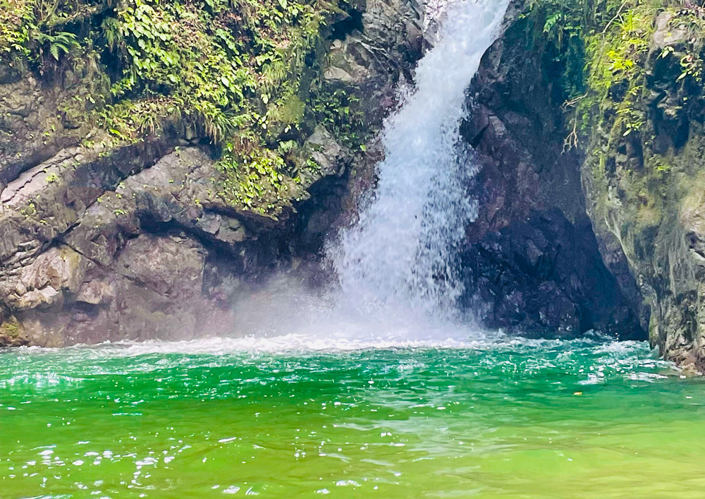 非現実的な青色の滝壺は、まるで龍神が身を横たえる龍宮のよう。